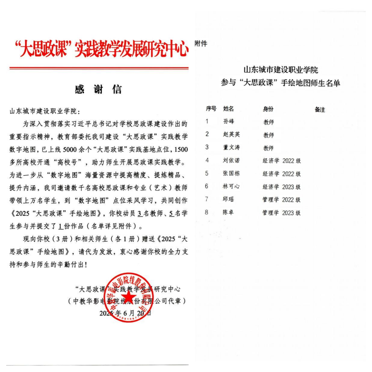 近日,全国“大思政课”实践教学发展研究中心向我校发来感谢信,对我校在“大思政课”实践教学数字地图建设和《2025“大思政课”手绘地图》创作中的全力支持和参与师生表示衷心感谢。