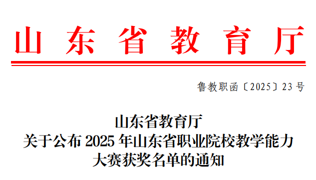 近日,山东省教育厅公布2025年山东省职业院校教学能力大赛结果,我校3支参赛团队全部获奖,斩获二等奖1项、三等奖2项,实现学校在该赛项上的新突破。