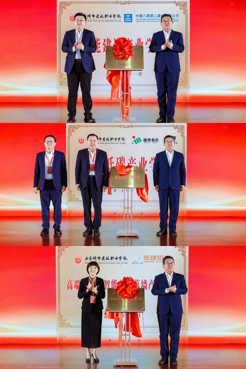 在产业学院揭牌仪式上,学校党委书记殷涛与中建八局第二建设有限公司董事长邵俊祥为共建智能建造产业学院揭牌;与国舜集团党总支书记吕和武、山东省城建设计院院长杨鼎新为共建绿色低碳产业学院揭牌:与山东华建铝业集团总裁丁三莲为共建高端铝材与智能门窗幕墙产业学院揭牌。