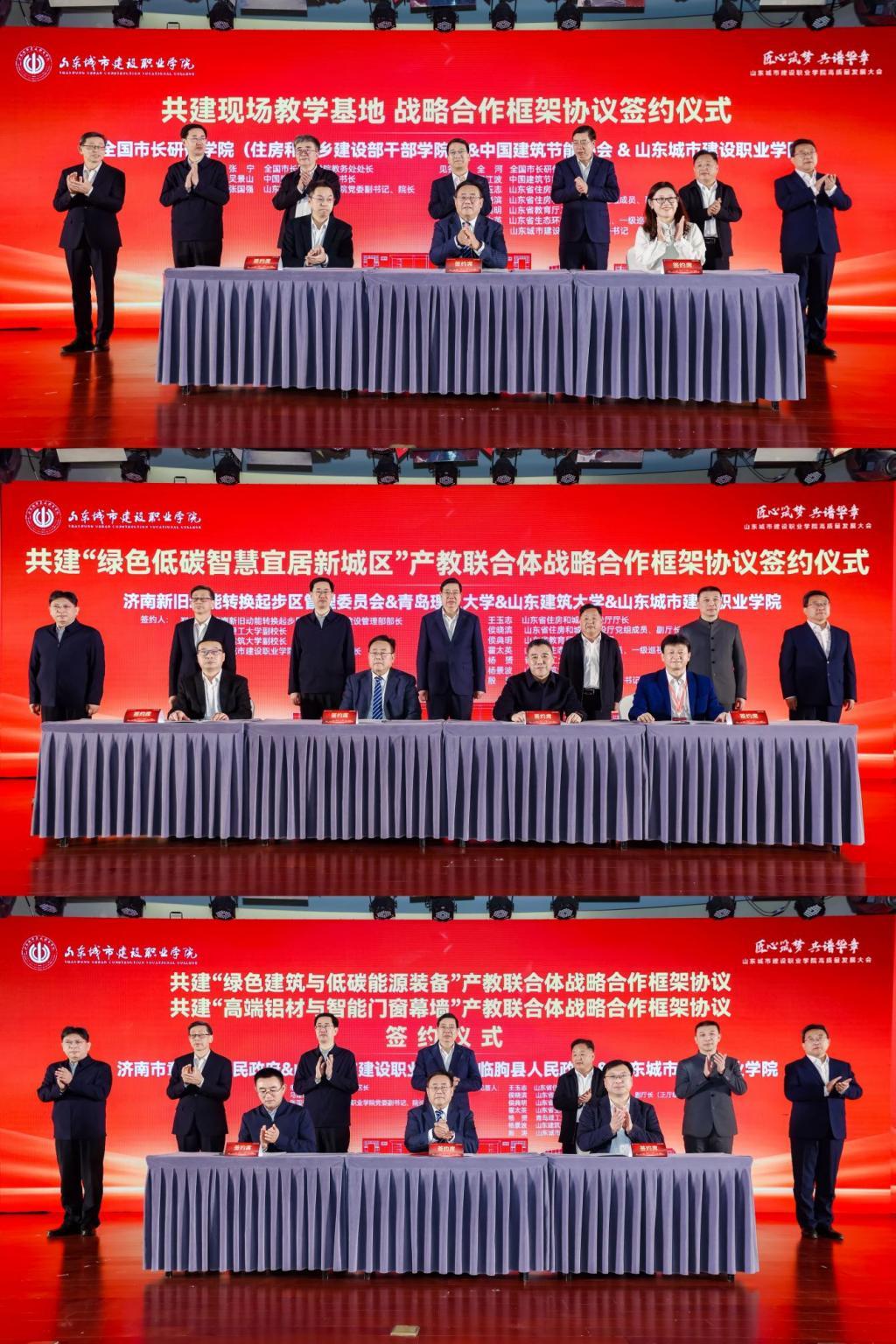 在战略合作协议签约仪式上,全国市长研修学院(住房和城乡建设部干部学院)教务处处长张宁、中国建筑节能协会秘书长吴景山与学校党委副书记、院长张国强共同签署战略合作框架协议;济南新旧动能转换起步区管理委员会建设管理部部长郑兆宇、青岛理工大学副校长金祖权、山东建筑大学副校长赵继龙与学校党委副书记、院长张国强共同签署“绿色低碳智慧宜居新城区”产教联合体协议;院长张国强还与章丘区人民政府副区长朱陆益、临朐县人民政府副县长马建涛分别签署“绿色建筑与低碳能源装备”产教融合协议、“高端铝材与智能门窗幕墙”产教合作协议。