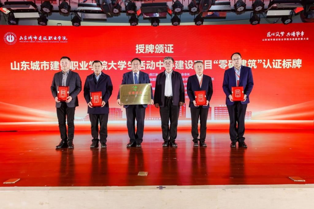 在“零碳建筑”认证标牌颁证授牌仪式上,中国建筑节能协会会长倪江波为学校大学生活动中心建设项目颁发“零碳建筑”认证证书和标牌。该中心由同圆设计集团、山东建筑大学设计集团、中建八局二公司等单位协同建造的,采用“低能耗设计+光伏综合利用+智慧运维”模式,成为山东省首个获得此认证的高校零碳建筑示范工程,标志着其在全生命周期内实现了综合碳排放为零的目标。