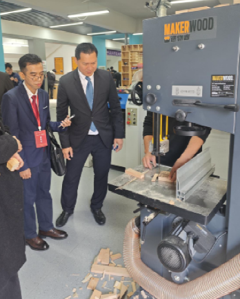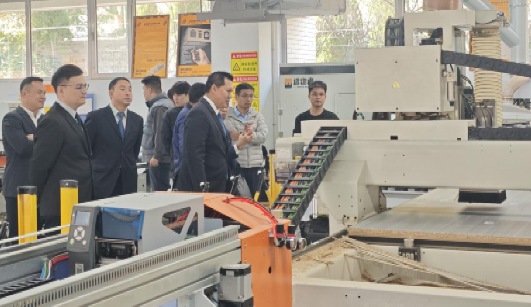 毛胜宁最后考察创艺工坊。这是我校人居环境研究中心的办公场所,也是室内设计和装饰装修工艺和用材的展示空间,还是用于进行建筑装饰演示教学、实操训练、实际产品加工的生产性实训基地。毛胜宁对我校拥有的木制品加工先进设备感到惊讶,认真观看学生测量长短厚薄、切割加工木料的全过程,希望柬埔寨学生也能来创艺工坊学技艺、练本领。