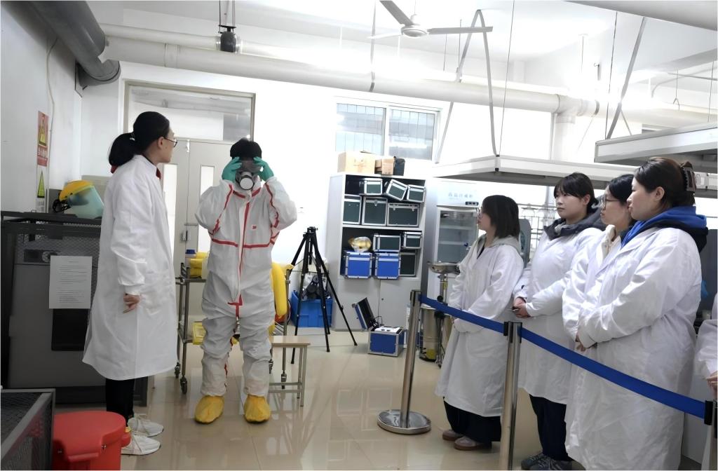 实验实训中心宁菲老师针对危险化学品安全进行专题培训,科学处置,转“危”为安。详细介绍了危险化学品的使用规范、安全防护用品的正确穿戴,以及危险化学品泄漏事故的应急处置流程。在现场演练中,指导学生演示了防护服、防护手套、防化靴的标准穿戴,并指导学生运用中和剂处理、吸附围挡等方式,对泄漏物进行了快速有效的处置。