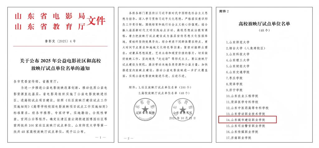 近日,山东省电影局与山东省教育厅联合印发《关于公布2025年公益电影社区和高校放映厅试点单位名单的通知》(鲁影发〔2025〕4号),我校成功入选首批山东省高校放映厅试点单位。这标志着学校在校园文化阵地建设方面取得又一重要成果。