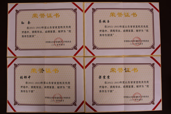 近日,共青团山东省省直机关工作委员会表彰了2012-2013年度“山东省省直机关优秀学生干部”和“山东省省直机关优秀学生团员”,我院市政系梁震震、建工系张铧中荣获“省直机关优秀学生干部”荣誉称号;建经管系蔡婉玉、工管系孙奎荣获“省直机关优秀学生团员”荣誉称号。