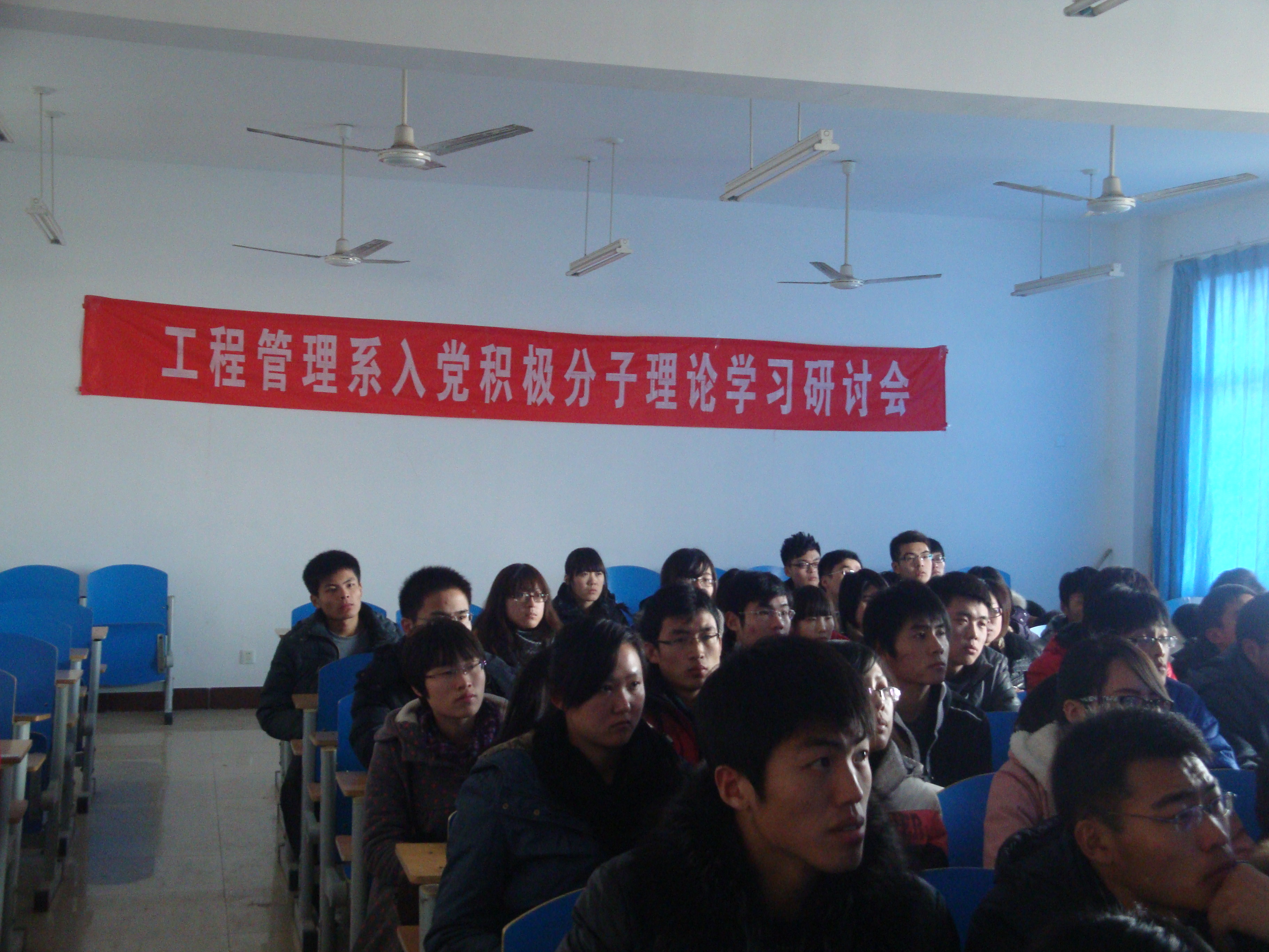 2011年12月27日下午工程管理系党支部在一号教学楼合堂一教室举办了入党积极分子第三次理论学习研讨会。工程管理系党支部支委全体参加了本次会议,宣传委员卜繁鸿同志主持了此次学习。